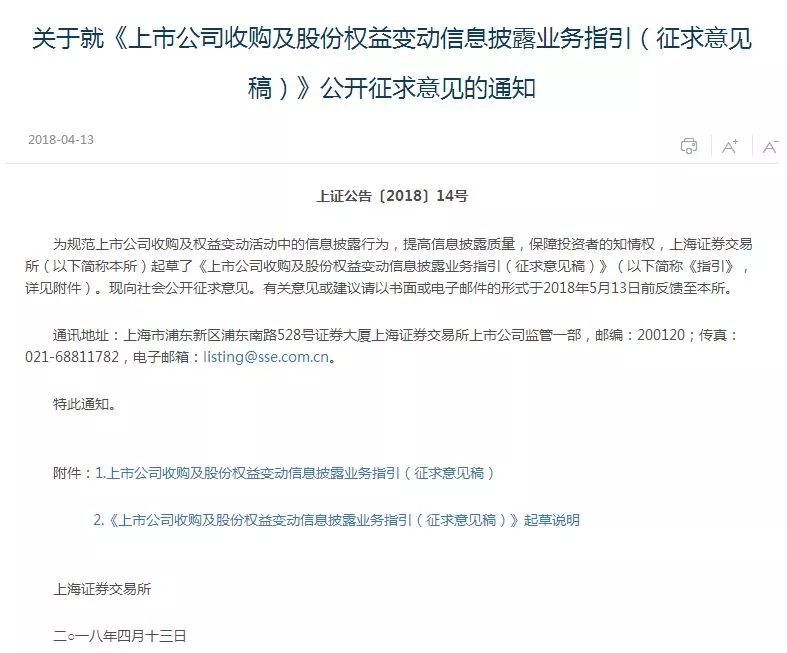 4月13日,滬深交易所發(fā)布《上市公司收購(gòu)及股份權(quán)益變動(dòng)信息披露業(yè)務(wù)指引(征求意見(jiàn)稿)》,進(jìn)一步規(guī)范投資者及其一致行動(dòng)人在上市公司收購(gòu)及相關(guān)股份權(quán)益變動(dòng)活動(dòng)中的信息披露行為。